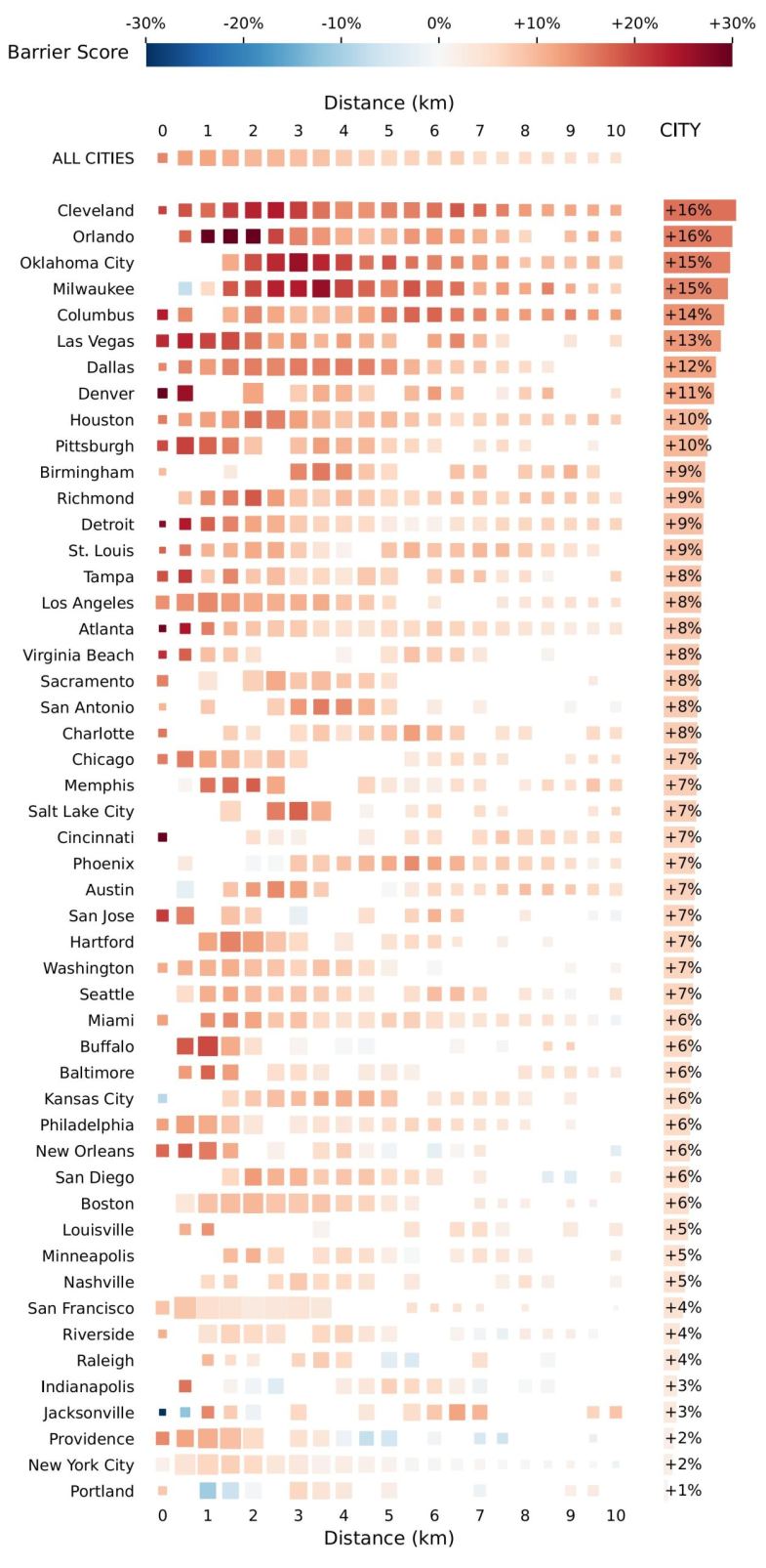 az Egyesült Államok 50 legnagyobb városán belül az emberek térbeli társadalmi kapcsolatainak vizsgálatával jutott arra a következtetésre, hogy az összes vizsgált amerikai városban a városi autópályák okozta gát különösen erős a rövid, 5 km-nél rövidebb távolságok esetében.